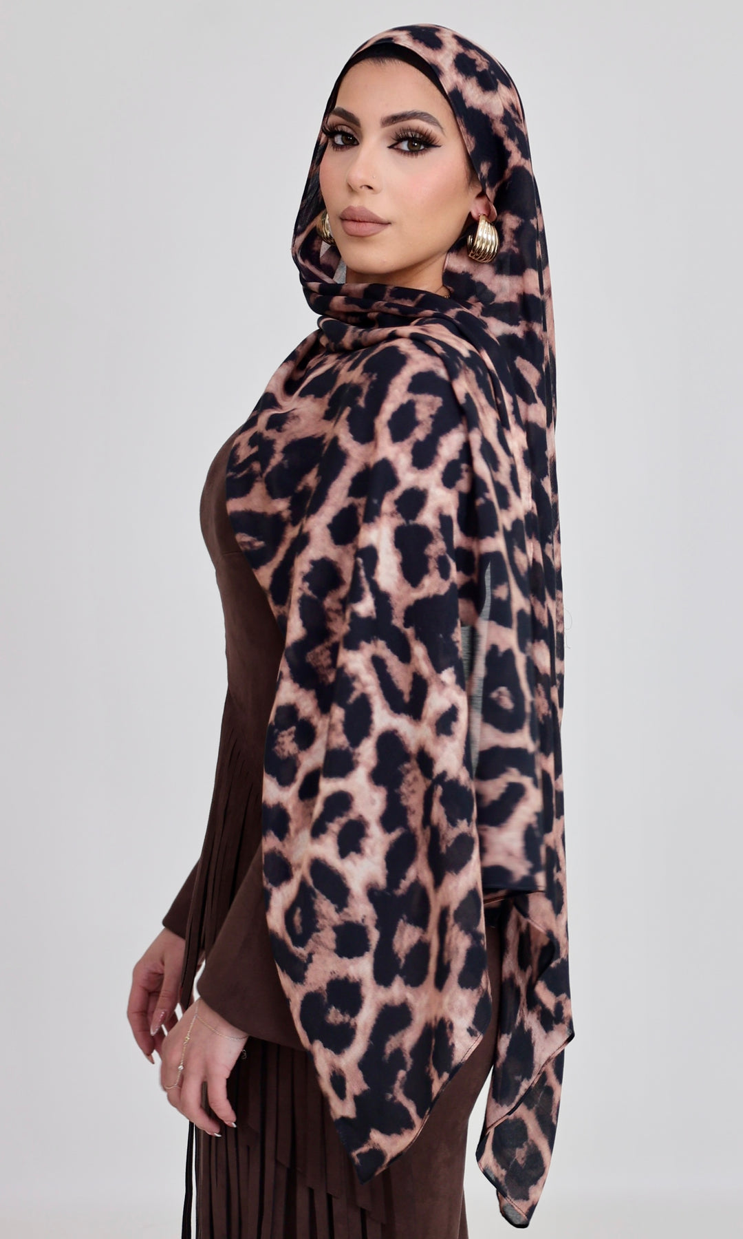 Unleash your untamed side with Sahara Wild — a daring leopard print hijab in rich brown and deep black tones. Crafted from soft, breathable modal, it combines fierce fashion with effortless comfort. Perfect for elevating basics or making a statement, this hijab is for the woman who owns every room she walks into.