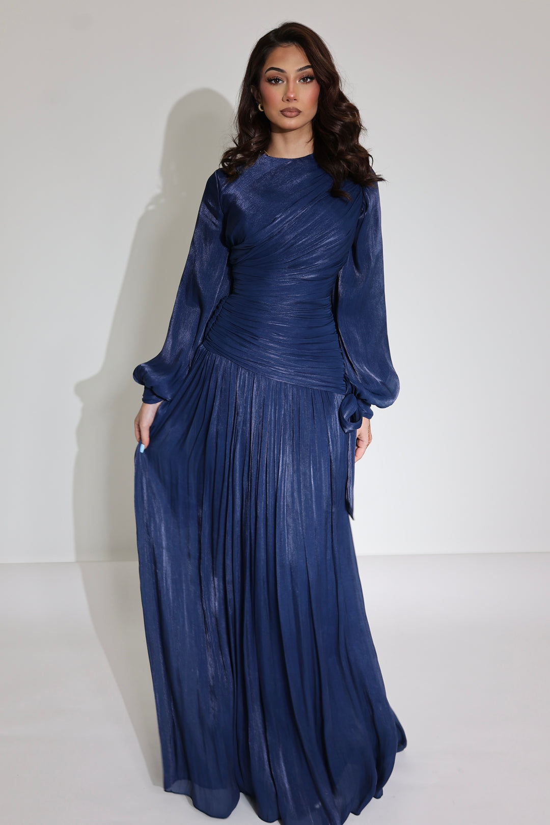 Elevate your evening look with our Luxe Draped Pleated Gown, a masterpiece of grace and sophistication. Designed with a flattering asymmetric drape across the bodice, this full-length gown features a cinched waist and finely pleated skirt for a romantic, statuesque silhouette. Voluminous long sleeves with gathered cuffs add a touch of vintage charm, while the shimmering fabric catches the light with every movement, ensuring you turn heads at any occasion. Zipper in the back model 5’5 wearing xsmall