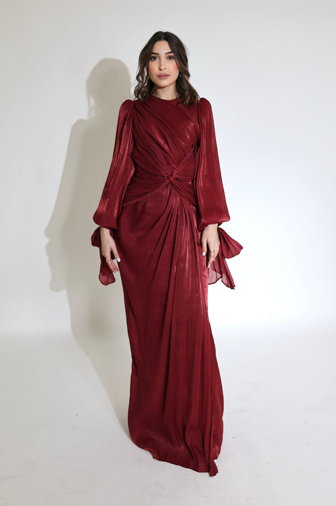 Introducing our stunning, Jasmina elegant gown, perfect for any occasion. This dress features a beautifully draped bodice with intricate, gathered fabric that creates a graceful, twisted knot at the waist, defining your silhouette with style and grace. The long, slightly puffed sleeves add a touch of romantic opulence, complete with delicate ties at the wrists for an extra flair. The skirt cascades gracefully to the floor, with soft pleats that add movement and flow to the entire ensemble.
