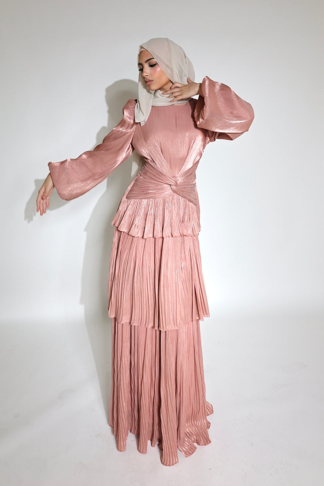 Discover timeless elegance with our stunning Pleated Ruffle Evening Dress. Crafted from luxurious, lightweight fabric that drapes beautifully, this dress features a figure-flattering A-line design. The top boasts a round neckline and subtly puffed long sleeves, adding a touch of drama. Intricate twists and gathers at the waist enhance an hourglass silhouette, while layers of exquisitely pleated fabric cascade gracefully from the skirt, creating movement and flow. This floor-length dress is perfect for weddings, evening events, and other formal occasions where elegance is paramount.
