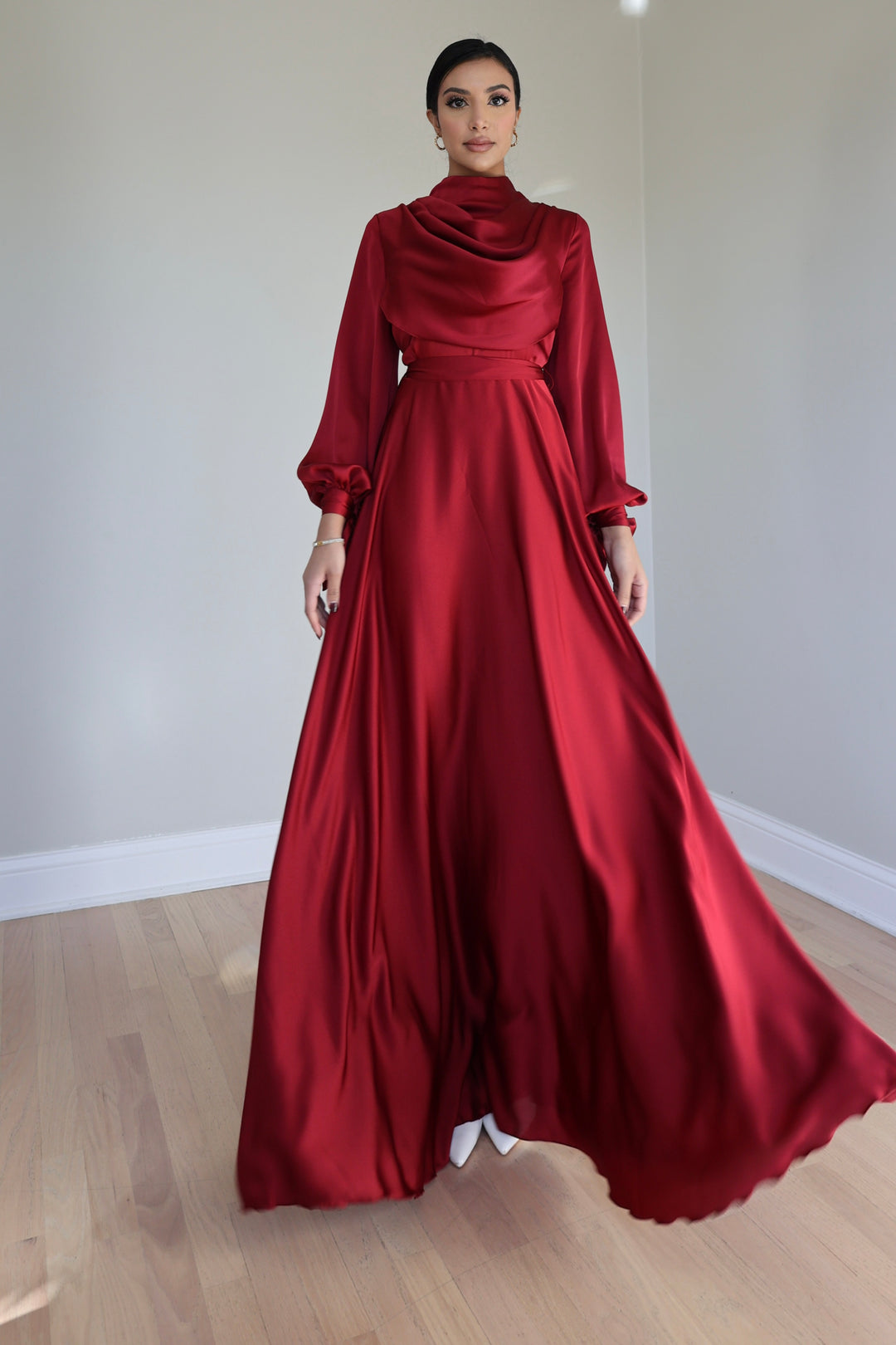 This gracefully slimming satin dress has a draped u shape around the high neck. our Romona dress flatters any body type! Has a strap to tie around the waist to give a smaller waist look!! Zipper is from the back.