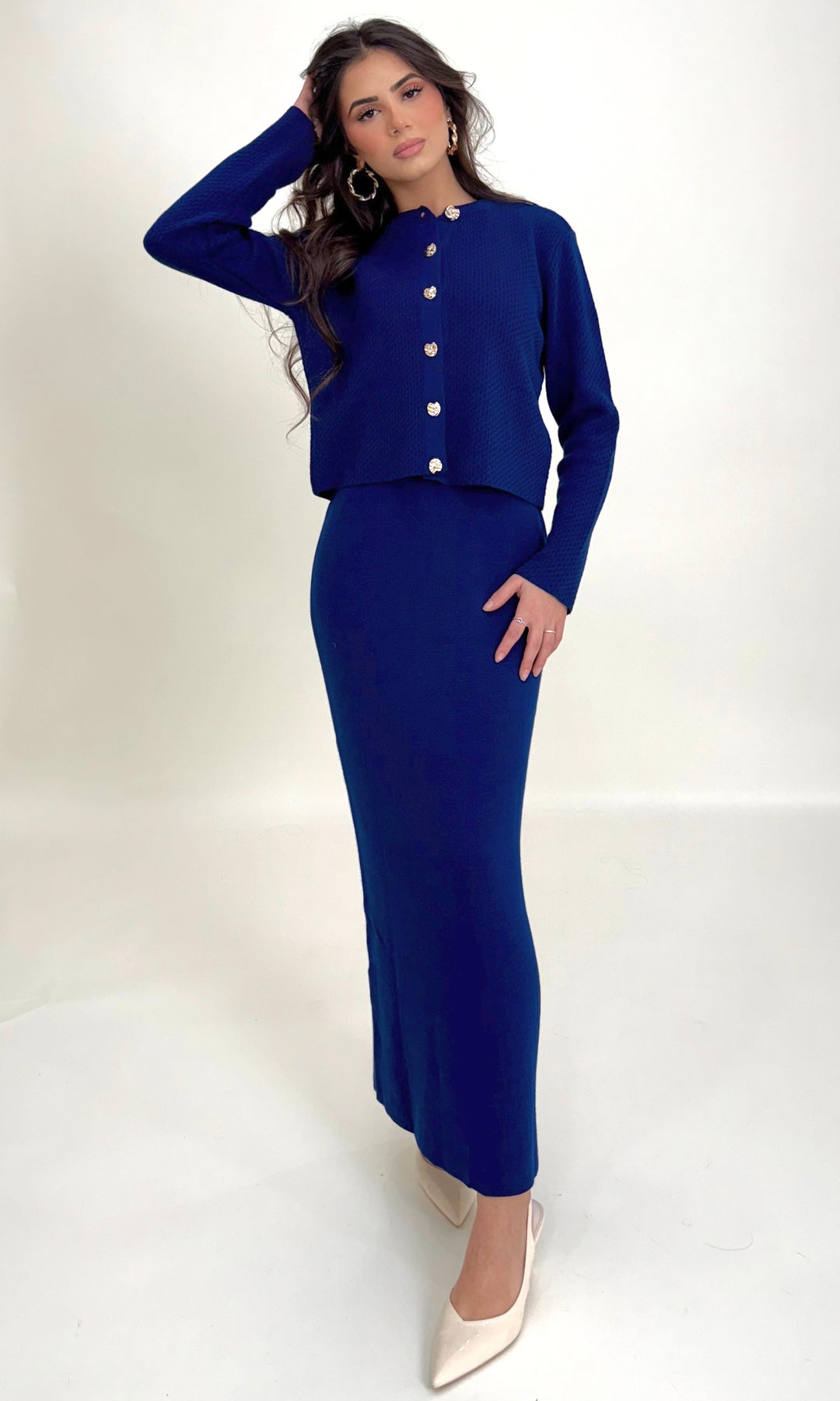 The dress offers a smooth, body-skimming silhouette with a comfortable stretch-knit fabric that flatters without clinging. Layered on top, the cardigan adds effortless sophistication with its soft waffle texture, front button detailing, and perfect cropped length that complements the dress beautifully.