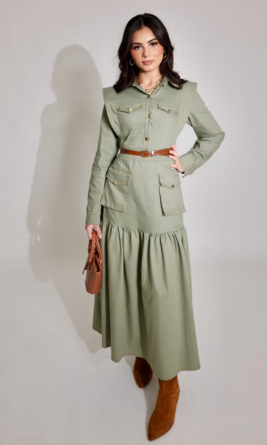 Elevate your everyday modest look with our Dona Maxi Dress, designed for women who love structure, elegance, and effortless style. This dress features a tailored bodice with defined shoulders, functional chest and hip pockets, and a soft A-line tiered skirt that moves beautifully with you.