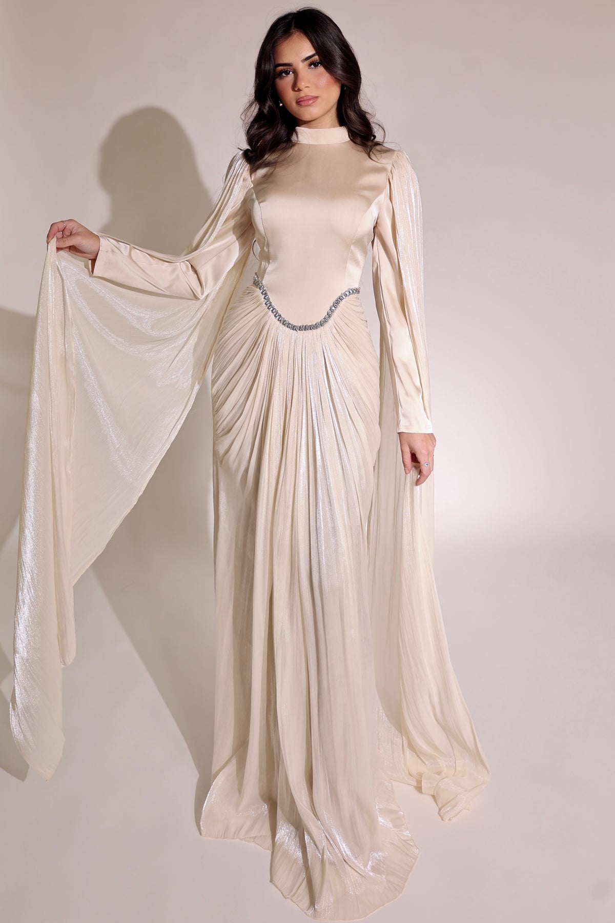 Make an elegant statement in this stunning Aliah evening gown. Designed with a sleek satin bodice and dramatic pleated chiffon draping, this piece combines sophistication with modern modesty. The gown features long sheer cape sleeves that flow gracefully with every movement, adding a touch of regal charm. A crystal-embellished waistline highlights the silhouette while offering just the right amount of shimmer.