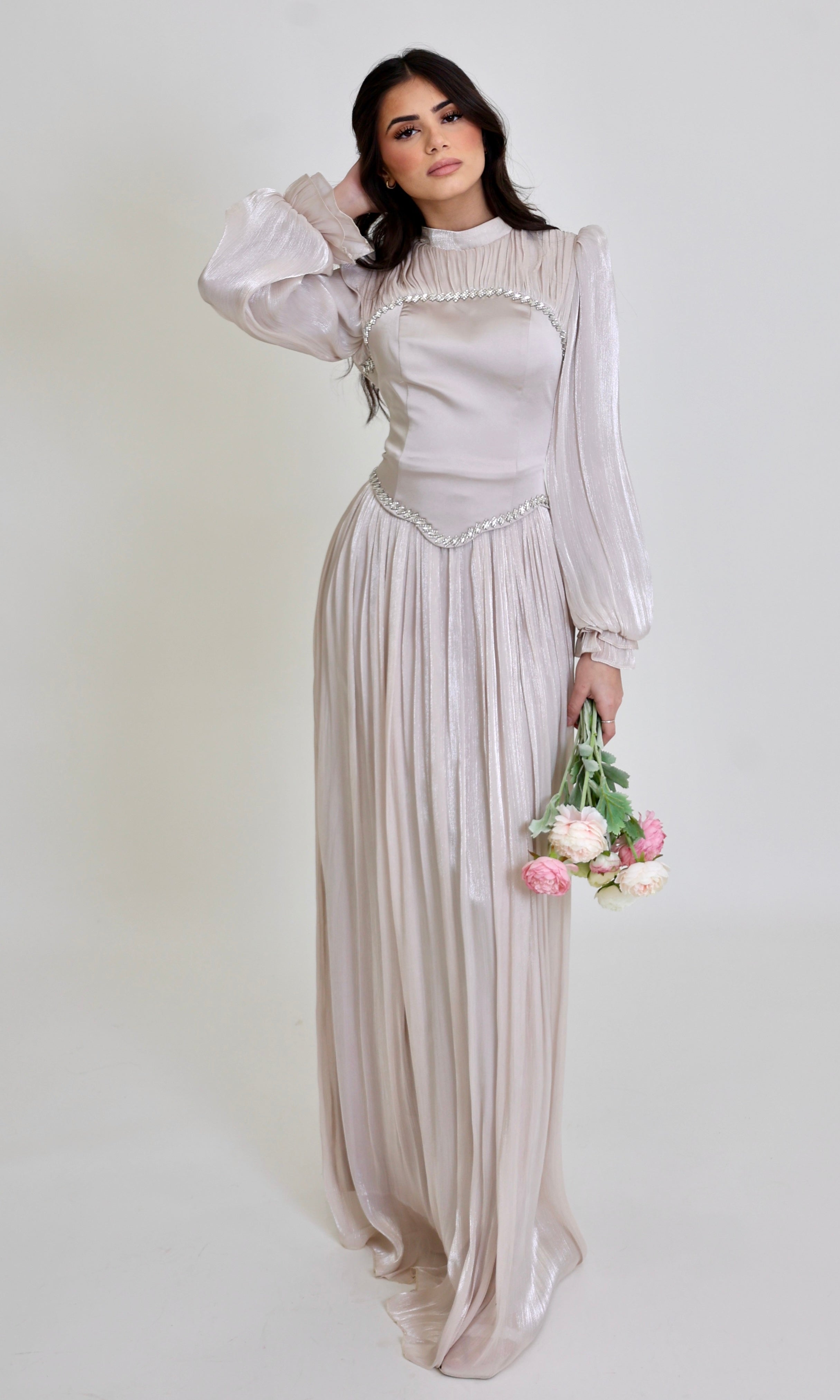 This fLora floor-length gown is designed with a structured bodice that contours the waist while maintaining an elegant, modest silhouette. Delicate crystal detailing traces the neckline and waist, adding a subtle shimmer that elevates the design without overpowering its soft femininity.