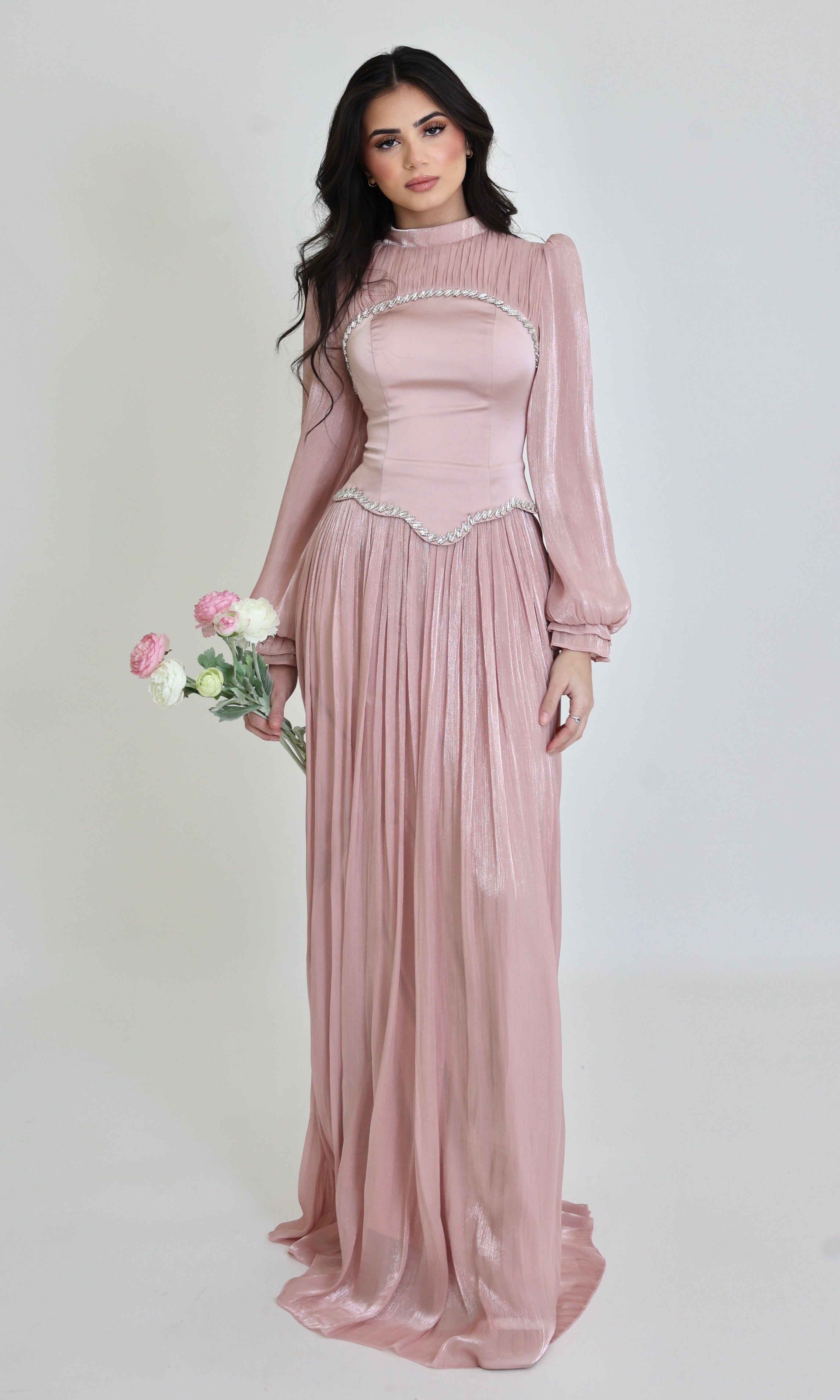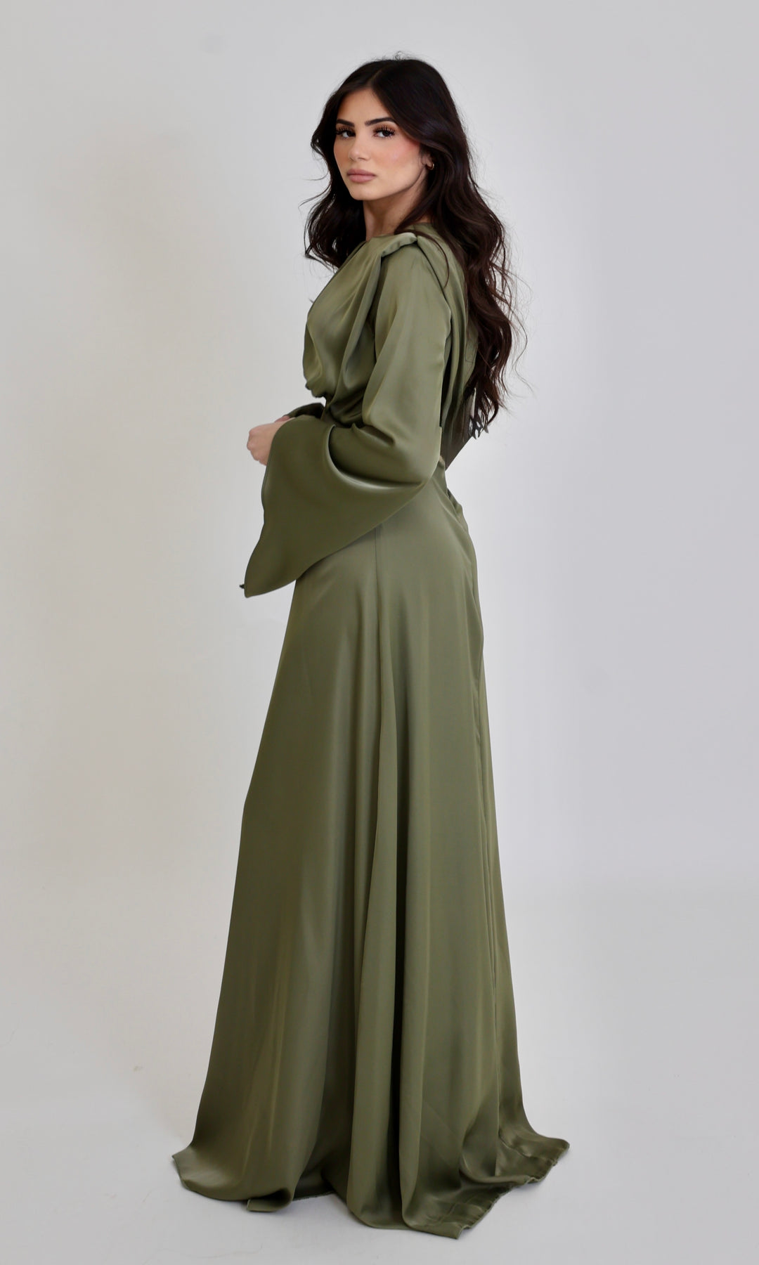 This elegant floor-length gown is designed to flatter while keeping modesty effortless. Featuring a softly draped bodice with gentle pleating and a cinched waist, it creates a beautiful silhouette without clinging. The long, flowy bell sleeves add movement and drama, giving the dress a timeless, graceful feel.