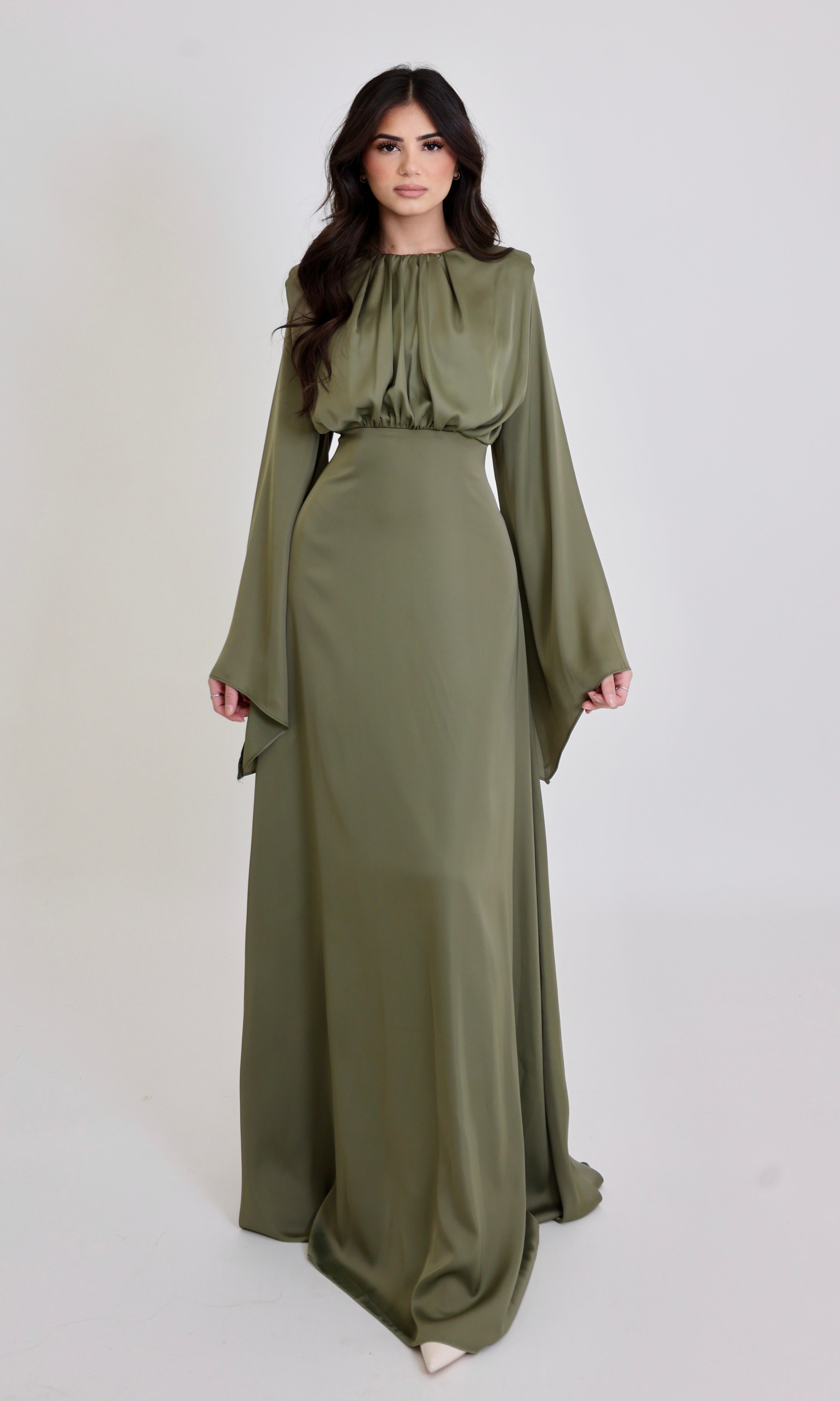 This elegant floor-length gown is designed to flatter while keeping modesty effortless. Featuring a softly draped bodice with gentle pleating and a cinched waist, it creates a beautiful silhouette without clinging. The long, flowy bell sleeves add movement and drama, giving the dress a timeless, graceful feel.