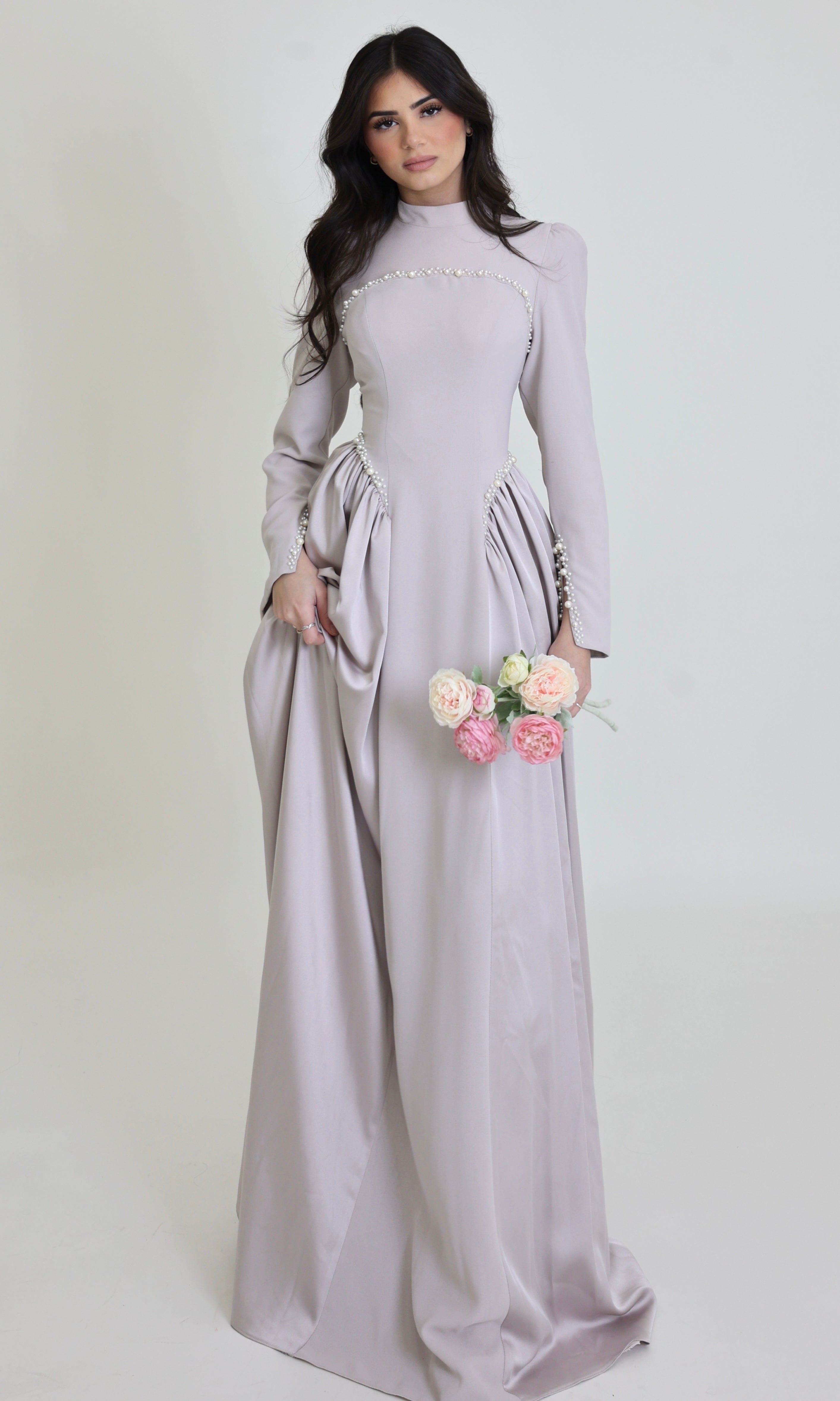 the NaraGown flows in an elegant sea-foam shimmer that flatters every movement. With delicate side pleating, a sculpted high neckline, and a single draped sleeve that cascades like a waterfall, this gown blends modern modesty with timeless beauty. Made for the woman who walks with calm confidence and grace, the Nara Gown is a statement of effortless elegance.