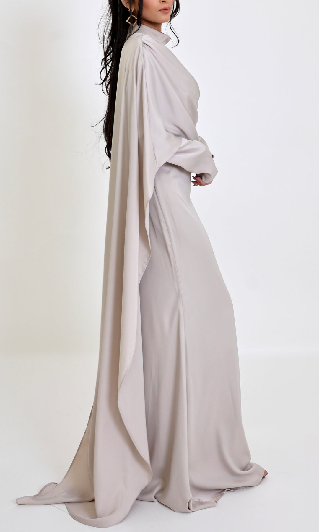 This statement gown features a beautifully draped cape overlay that can be styled multiple ways, allowing you to customize your look with ease. Designed with a sleek, fitted base and a soft wrap-style cape, it creates an elegant silhouette while offering full coverage and effortless movement.