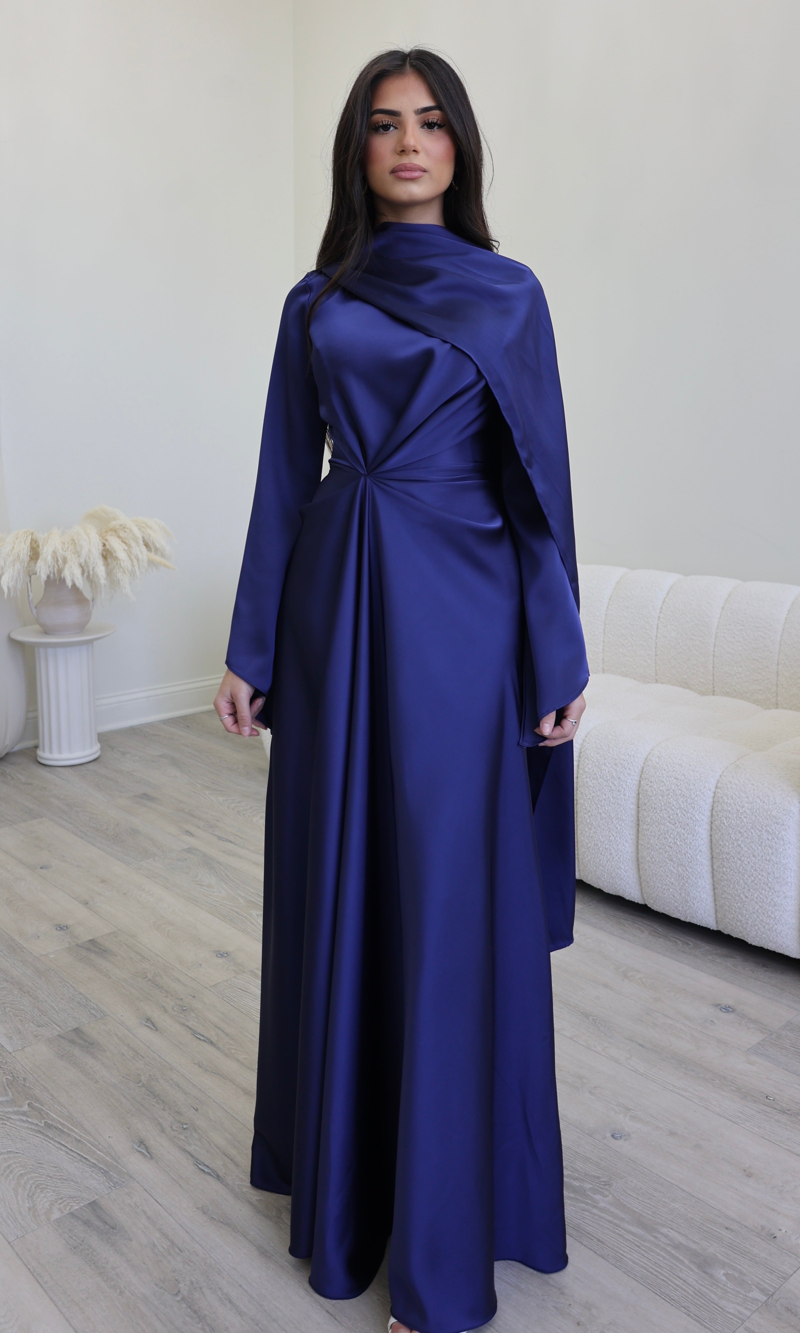 This stunning floor-length gown is designed with a versatile attached draped cape, allowing you to style it in multiple ways for different looks. The cape is seamlessly connected to the dress, giving you the option to drape it over the shoulder, let it flow freely, or wrap it around for added coverage.