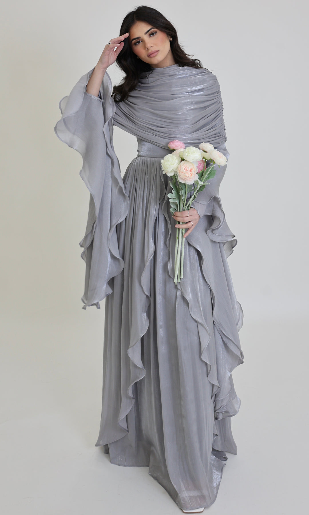 The soft, cascading sleeves and pleated skirt make this gown perfect for weddings, formal occasions, or evening events.