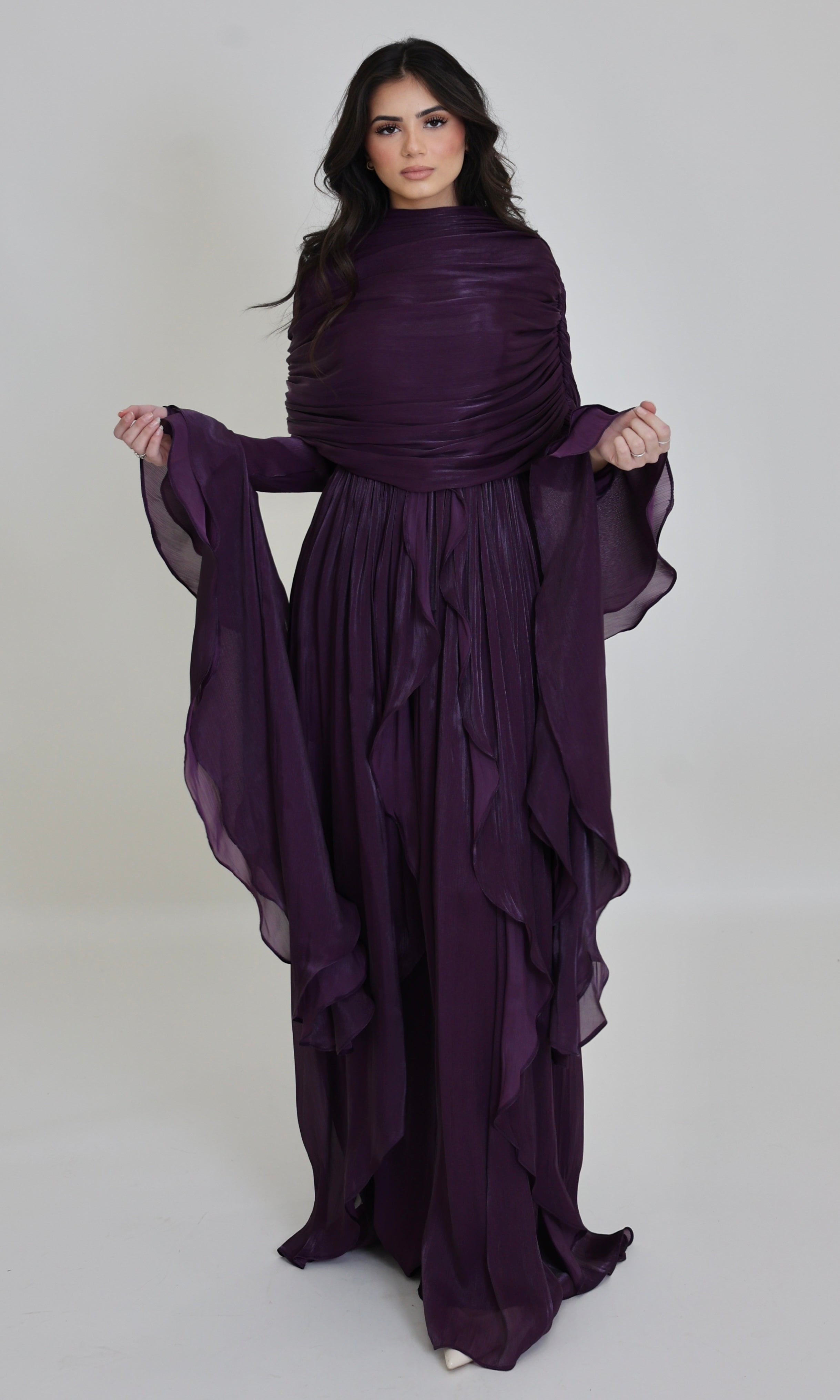 The soft, cascading sleeves and pleated skirt make this gown perfect for weddings, formal occasions, or evening events.