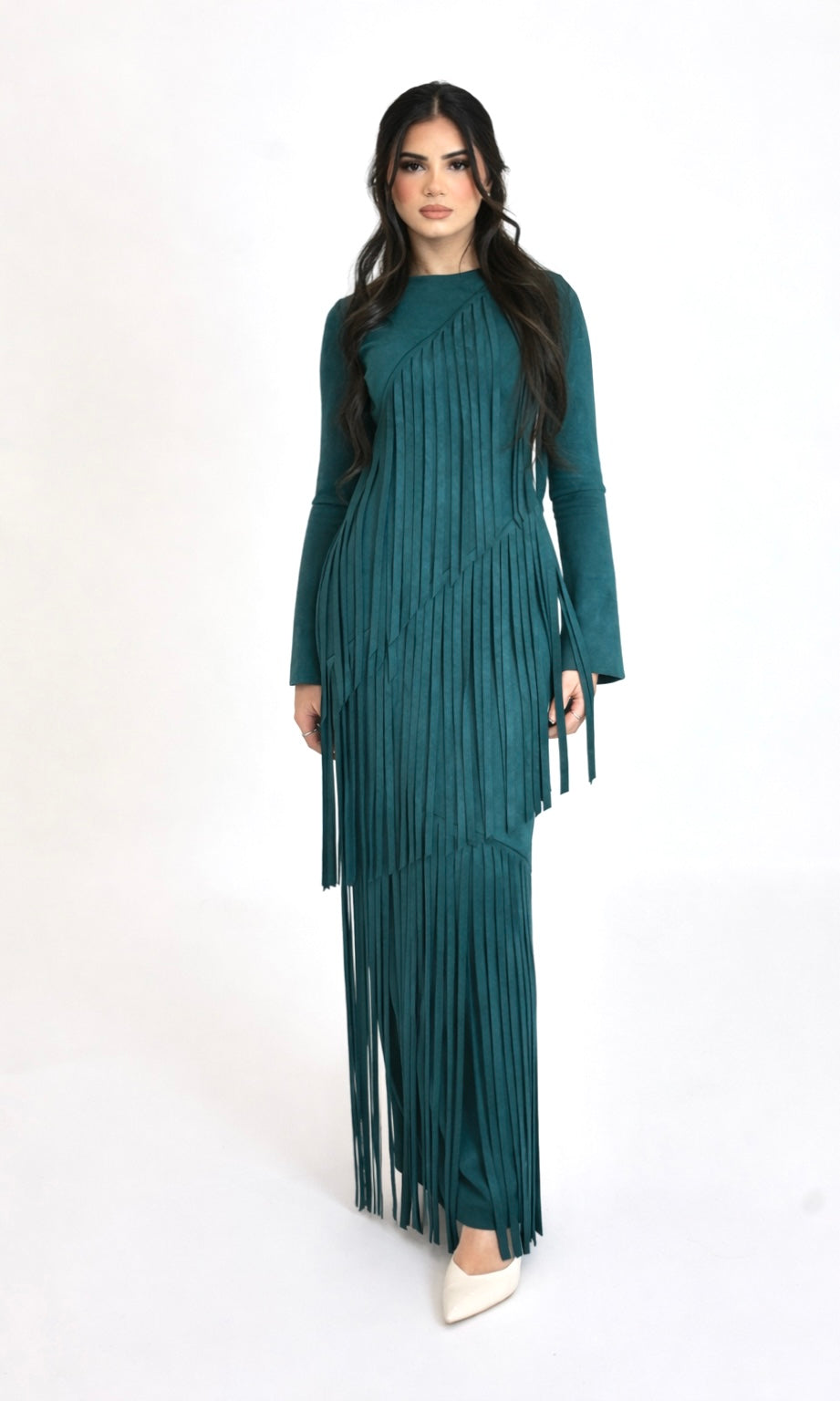 The top features a smooth, sculpted suede finish, while the asymmetric paneling at the waist creates a flattering, cinched effect. The standout detail? Long layered fringe that cascades down the skirt, adding drama and flow with every step. It’s modest, sophisticated, and bold — a true designer piece made to stand out.