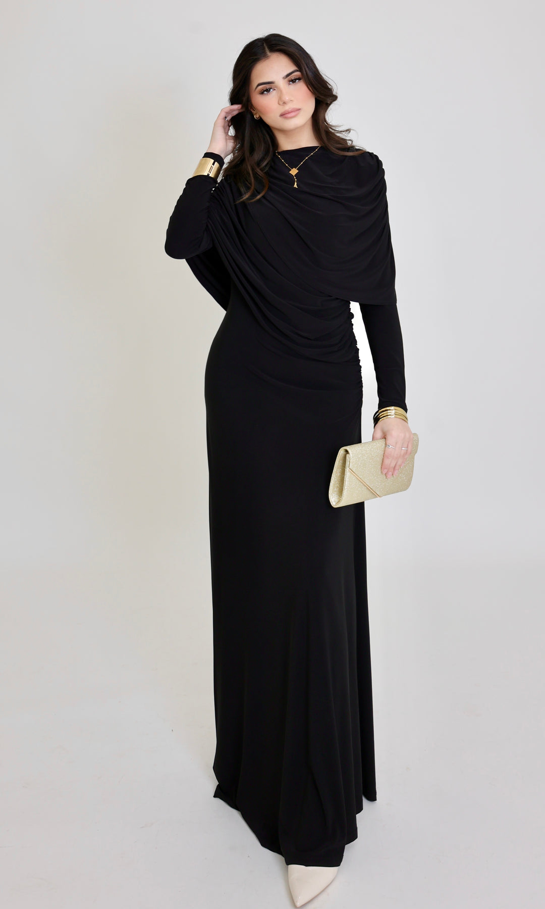 Elegance made effortless. This full-length draped gown features a rich cocoa brown shade that falls beautifully on every skin tone. Designed with soft, cascading drapes across the shoulders and bodice, it creates a refined, sculpted silhouette without compromising on comfort.