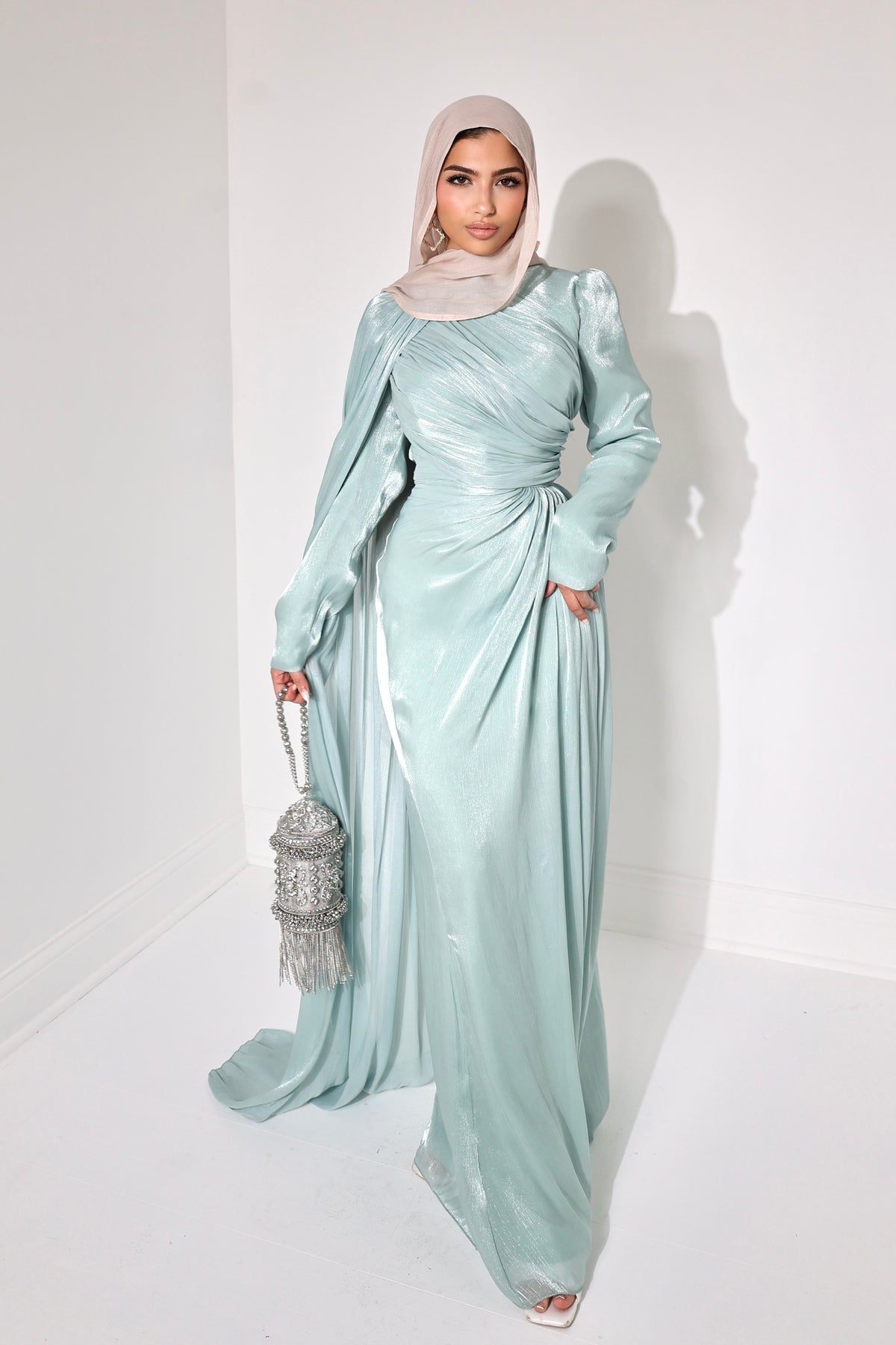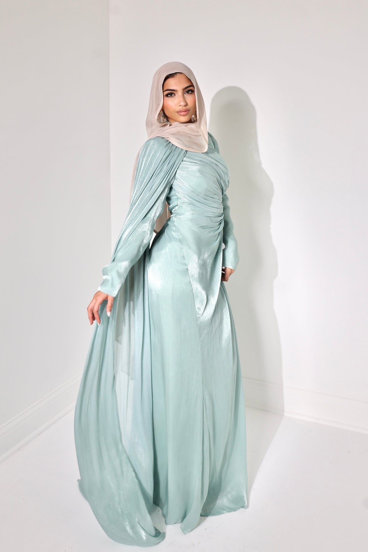 the Nara Gown flows in an elegant sea-foam shimmer that flatters every movement. With delicate side pleating, a sculpted high neckline, and a single draped sleeve that cascades like a waterfall, this gown blends modern modesty with timeless beauty. Made for the woman who walks with calm confidence and grace, the Mayar Gown is a statement of effortless elegance.
