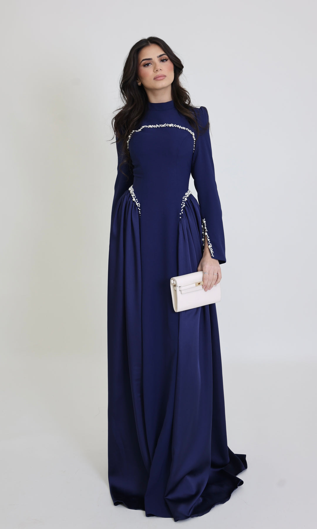 Designed for the woman who loves refined glamour with a modest silhouette. The Vivienne Gown features a structured, figure-flattering bodice accented with delicate pearl embellishments that trace the neckline, waist, and sleeve details for a subtle yet luxurious Finnish